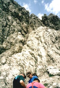 zum zweiten Mal eingeholt habe. Dies zwang mich meine Energiereserve (Isostar von Aldi) auszupacken und zuzuschauen, wie der Bergführer einigen behilflich sein musste, den Klettergurt anzulegen. Wie ich da schon erahnen konnte, war die Gruppe vollkommen unerfahren, die meisten hatten noch nie einen Gurt an und noch nie einen Klettersteig begangen. Die einzige Anmerkung des für mich unfähigen Bergführers war: Ihr müsst immer auf die Dreipunkt-Haltung achten!" Wobei einige Nachfragten, was das überhaupt sein soll? Jeder Kommentar dazu erübrigt sich wohl. Also wartete ich ab, bis sie die erste 3m Wand überwunden hatten und das Steinschlagrisiko einiger massen gebannt war. Doch nun musste ich an ihnen vorbei und wurde von ihnen keines Blickes gewürdigt, dies liegt wohl daran, dass ich mein Lachen nicht halten konnte.